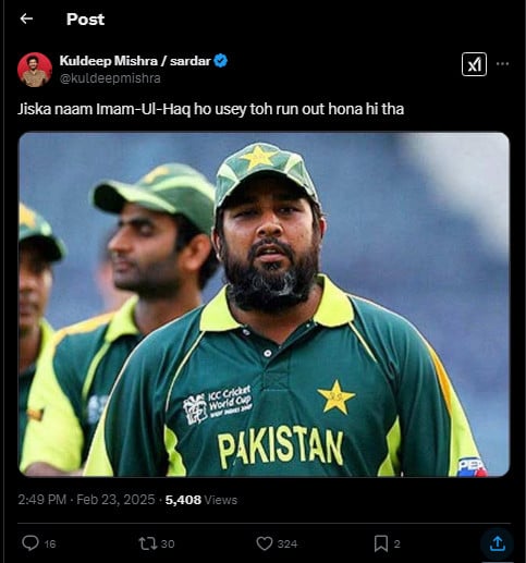 دبئی میں کھیلے جارہے چیمپئینز ٹرافی کے اہم معرکے میں اوپنر امام الحق 23 گیندوں پر محض 10 رنز بناکر اکشر پٹیل کے ہاتھوں رن آؤٹ ہوئے تو سوشل میڈیا پر میمز کی برسات ہوگئی۔انہوں نے مڈ آن کی طرف شارٹ کھیلا اور دوڑ پڑے تاہم وہ کریز میں نہ پہنچ سکے، اس وقت اکشر پٹیل نے وکٹ پر تھرو کی اور وہ رن آؤٹ ہوگئے۔نیوزی لینڈ کیخلاف انجری کا شکار ہونیوالے فخر زمان کی جگہ امام الحق اسکواڈ کا حصہ بنایا گیا تھا۔