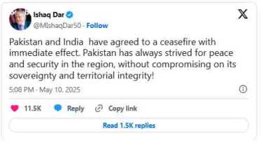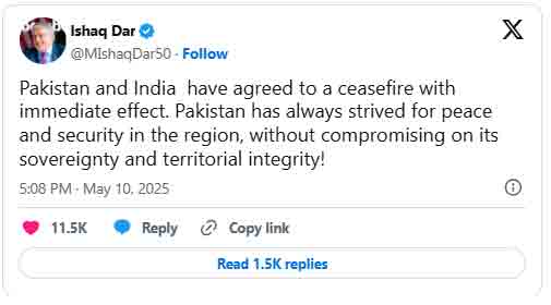اسحاق ڈار نے جنگ بندی کی تصدیق کرتے ہوئے کہا کہ آج شام ساڑھے 4 بجے سے سیزفائر نافذ العمل ہو گیا ہے۔