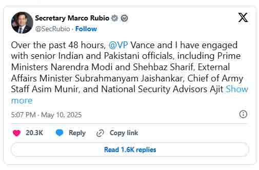 امریکی وزیر خارجہ مارکو روبیو اور نائب صدر وینس نے بھارتی و پاکستانی رہنماؤں سے مذاکرات کئے، مذاکرات میں بھارتی اور پاکستانی آرمی چیف اور قومی سلامتی کے مشیروں نے بھی شرکت کی۔