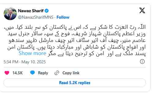 سماجی رابطے کی سائٹ ایکس پر اپنے پیغام میں صدر مسلم لیگ ن و سابق وزیراعظم شہباز شریف نے کہا کہ میں وزیر اعظم پاکستان شہباز شریف، فوج کے سپہ سالار جنرل سید عاصم منیر، چیف آف ایئر سٹاف ایئر چیف مارشل بابر ظہیر سدھو اور افواجِ پاکستان کو شاباش اور مبارکباد دیتا ہوں۔