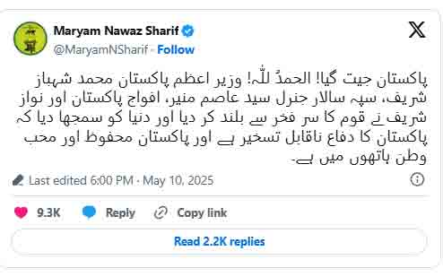 سماجی رابطے کی سائٹ ایکس پر اپنے پیغام میں وزیراعلیٰ پنجاب مریم نواز شریف نے کہا کہ الحمد للہ پاکستان جیت گیا، قوم کو فتح مبارک ہو۔