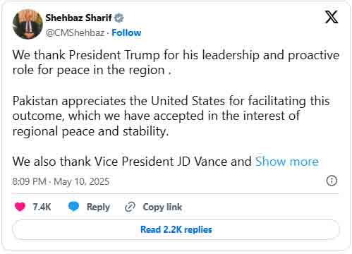 سماجی رابطے کی سائٹ ایکس پر اپنے پیغام میں وزیراعظم شہباز شریف نے کہا کہ پاکستان امریکا کا اس پیش رفت میں سہولت کاری پر شکریہ ادا کرتا ہے، پاکستان نے علاقائی امن و استحکام کے مفاد میں اس فیصلے کو قبول کیا ہے۔