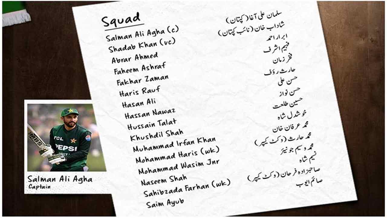 نئی سلیکشن کمیٹی کے مطابق آل راؤنڈر سلمان علی آغا کو ٹیم کی قیادت سونپی گئی ہے جبکہ شاداب خان نائب کپتان کی حیثیت سے سکواڈ کا حصہ ہوں گے، ٹیم میں نوجوان اور تجربہ کار کھلاڑیوں کا امتزاج رکھا گیا ہے تاکہ کارکردگی اور مستقبل کی تیاری میں توازن قائم رکھا جا سکے۔
