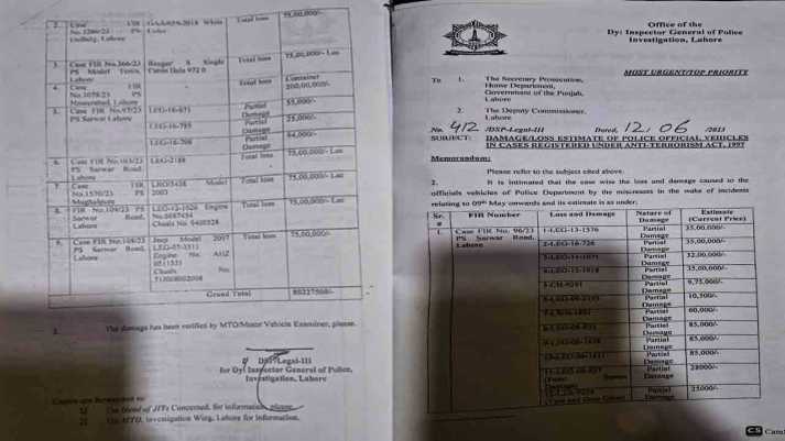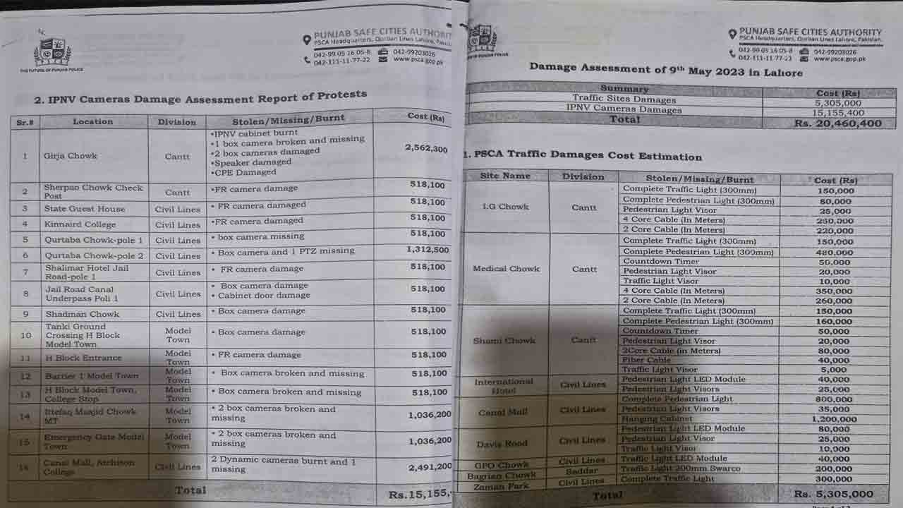 دستاویزات کے مطابق نو مئی واقعات میں کیمروں، سرکاری گاڑیوں اور ٹریفک سگنلز کی مد میں مجموعی طور پر 10 کروڑ 68 لاکھ 7 ہزار 900 روپے کا نقصان کیا گیا، لاہور میں نو مئی کے واقعات میں پولیس اور رینجرز کی 21 گاڑیاں تباہ ہوئیں، شہر کے نو تھانوں کی حدود میں نو مئی کو درجنوں سرکاری گاڑیاں توڑی گئیں، نو مئی کے واقعات میں سرکاری گاڑیوں کو 8 کڑور 22 لاکھ 7 ہزار 500 روپے کی مالیت کا نقصان پہنچایا گیا۔