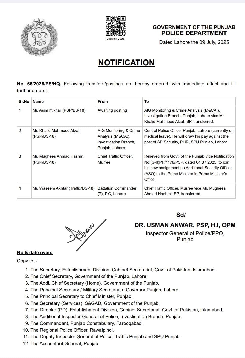 تفصیلات کےمطابق آئی جی پنجاب ڈاکٹر عثمان انور نے عاصم افتخار کو اے آئی جی مانیٹرنگ انویسٹی گیشن آفس لاہور تعینات کردیا، اسی طرح وسیم اختر کوسی ٹی او مری ،مغیث احمد کو ایڈیشنل سکیورٹی افسر پرائم منسٹر آفس لاہور جبکہ خالد محمود افضل کو ایس پی سکیورٹی ایس پی یو لاہور تعینات کردیا گیا ہے۔