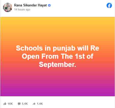 وزیر تعلیم رانا سکندرحیات نے کہا ہے کہ سکولوں میں 31 اگست تک چھٹیاں بڑھا دی گئیں، انہوں نے سماجی رابطے کی ویب سائٹ ایکس پر بتایا کہ اب سکول یکم ستمبر سے دوبارہ کھلیں گے۔