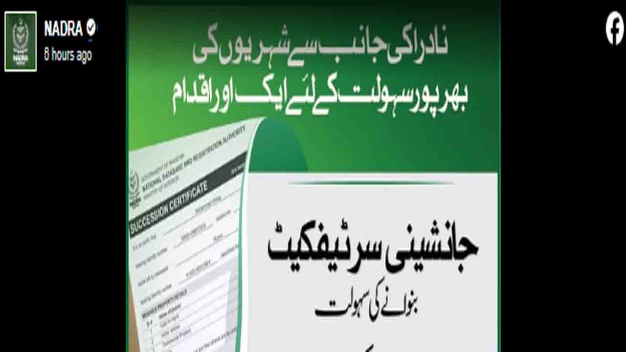 نادرہ کی جانب سے جاری کردہ فیس بک پوسٹ کے مطابق جانشینی سرٹیفکیٹ بنوانے کی سہولت اب تمام نادرا مراکز میں موجود ہے۔