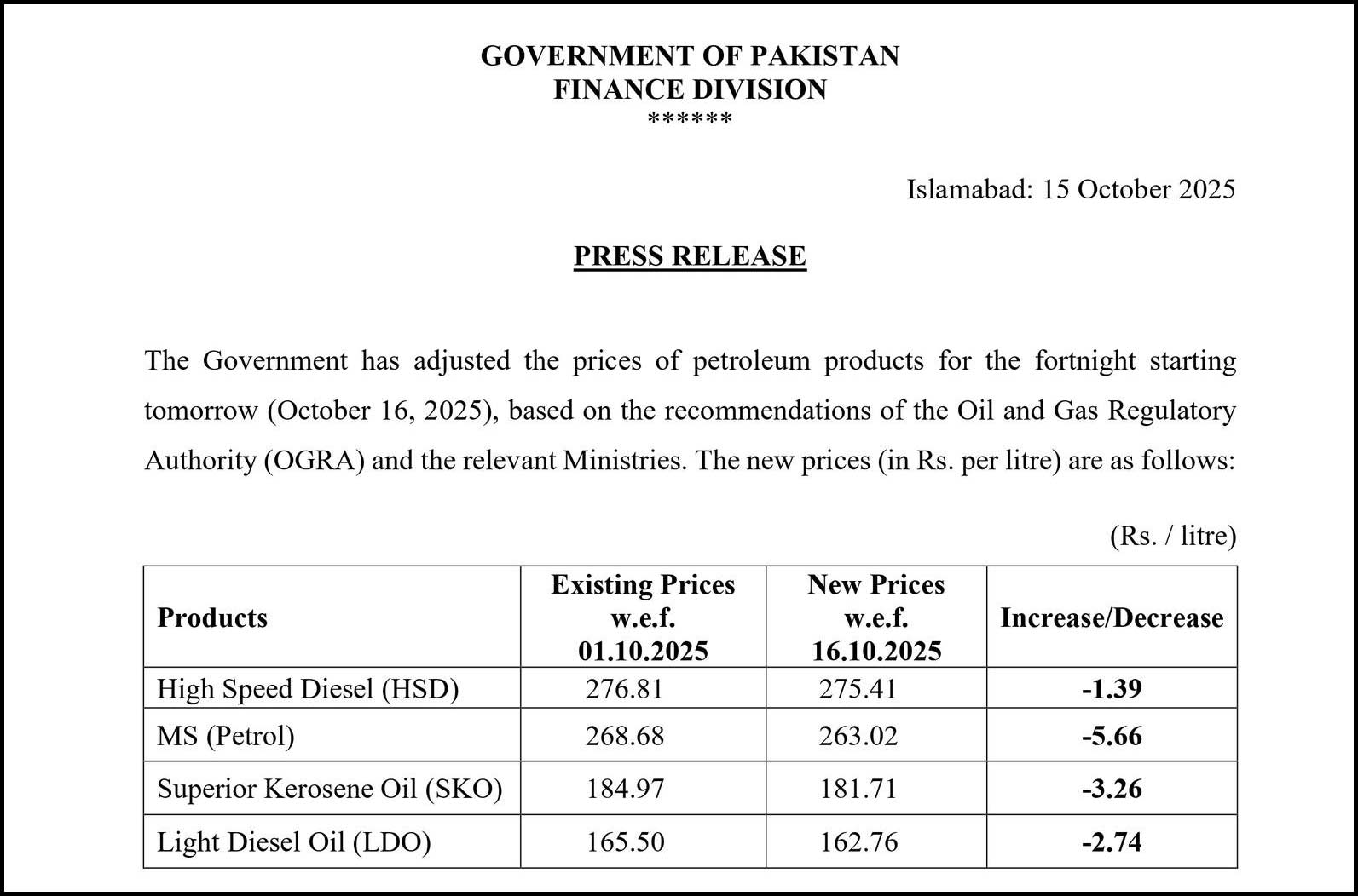 وزیراعظم کی جانب سے پٹرولیم مصنوعات کی قیمتوں 5 روپے66 پیسے فی لٹر تک کمی کی منظوری دی گئی ہے، وزارت خزانہ میں پٹرولیم مصنوعات کی قیمتوں میں کمی کا نوٹیفکیشن بھی جاری کر دیا ہے۔
