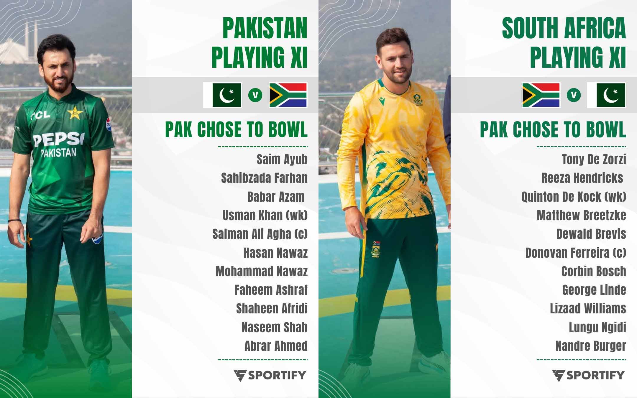میچ راولپنڈی سٹیڈیم میں کھیلا جارہا ہے، جو پنک تھیم میں ہورہا ہے، پاکستان کی جانب سے ٹیم کی قیادت سلمان علی آغا کر رہے ہیں، جب کہ جنوبی افریقہ کی کمان ڈونوون فریرا کے ہاتھوں میں ہے۔