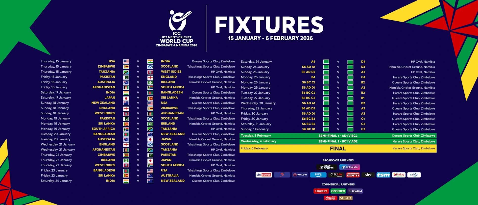 شیڈول کے مطابق میگا ایونٹ 15 جنوری سے 6 فروری تک زمبابوے اور نمیبیا میں کھیلا جائے گا۔گروپ اے میں بھارت، بنگلا دیش، امریکا اور نیوزی لینڈ کی ٹیمیں جبکہ گروپ بی میں پاکستان، زمبابوے، انگلینڈ اور سکاٹ لینڈ کی ٹیمیں شامل ہیں۔