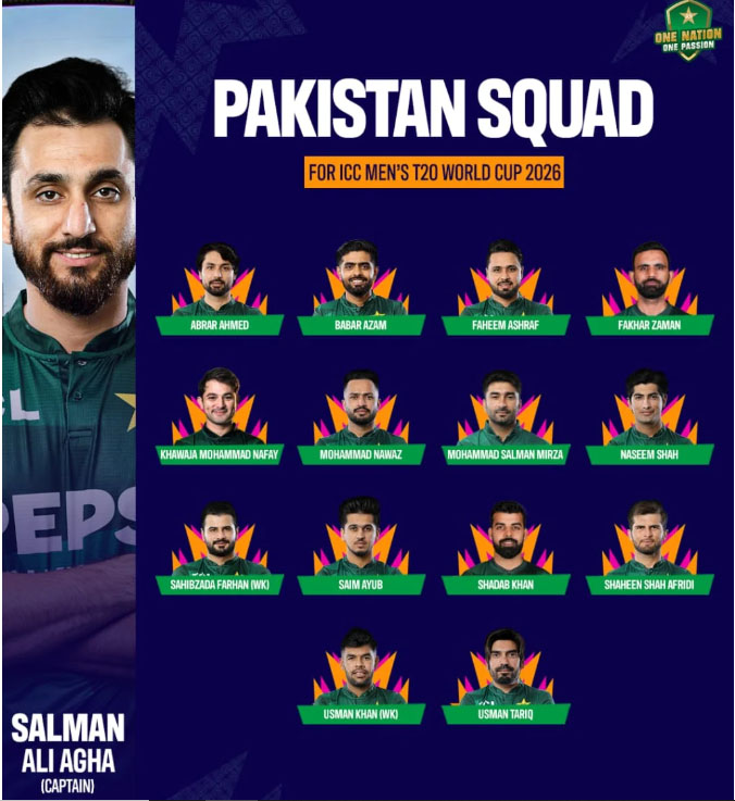 (لاہور نیوز) پاکستان نے ٹی ٹوئنٹی ورلڈ کپ 2026 کے لیے 15 رکنی سکواڈ کا اعلان کر دیا۔
