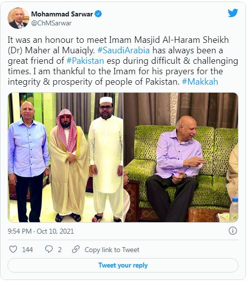 گورنر پنجاب چودھری سرورنے سماجی رابطے کی ویب سائٹ پر ٹوئٹ کیا جس انہوں نے امام کعبہ شیخ ڈاکٹر ماہر المعیقلی سے ملاقات کی تصاویر شیئرکیں۔