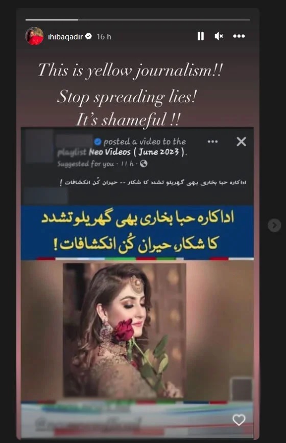 تاہم بعد ازاں اداکارہ کے انٹرویو کو غلط رخ دیتے ہوئے رپورٹ کیا گیا جسے ہزاروں قارئین نے پڑھا بھی اور دیکھا بھی۔تاہم اب حبا بخاری نےاپنے سوشل میڈیا اکاونٹ سکرین شاٹ شیئر کرتے ہوئے اسے زرد صحافت قرار دیا ہے اور لکھا ہے کہ جھوٹی خبریں پھیلانا بند کرو ، یہ شرمناک ہے۔