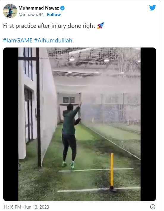 سماجی رابطے کی ویب سائٹ ٹوئٹر پر شیئر کی گئی ویڈیو میں محمد نواز کو بولنگ کی پریکٹس کرتے دیکھا جاسکتا ہے جبکہ ویڈیو کے ساتھ شیئر کی گئی ٹوئٹ میں محمد نواز نے اللہ کا شکر ادا کیا ۔واضح رہے کہ پاکستان کرکٹ ٹیم کے آل راؤنڈر محمد نواز نیوزی لینڈ کیخلاف تیسرے ون ڈے میچ کے دوران انجری کا شکار ہوگئے تھے۔پی سی بی کے مطابق محمد نواز کو ایکسرے کیلئے لے جایا گیا تھا جس کے بعد بتایا گیا کہ محمد نواز کی انگلی پر گیند لگنے کے بعد سوجن آئی تھی۔