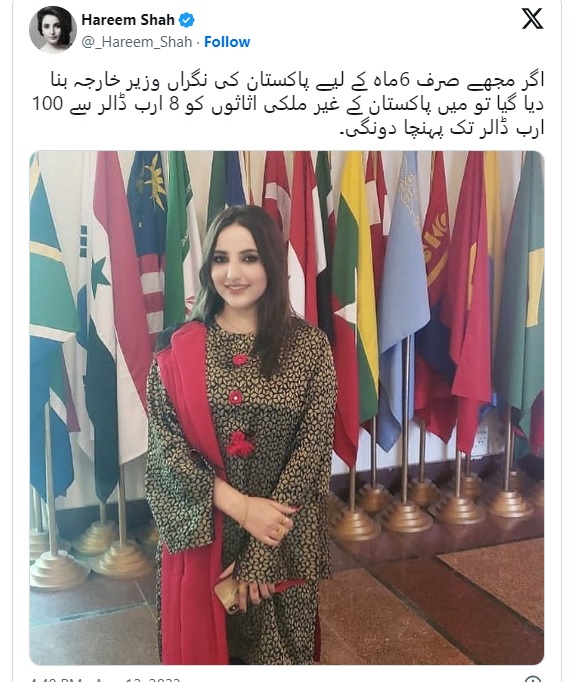 سماجی رابطوں کی ویب سائٹ پر اپنے پیغام میں ٹک ٹاکر نے اس بات کا برملا اظہار کیا کہ اگر انہیں نگران وزیر خارجہ بنا دیا جائے تو وہ ملک کے غیر ملکی اثاثوں کو 8 ارب ڈالرسے 100 ارب ڈالر تک پہنچا دیں گی۔