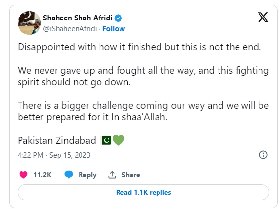 (ویب ڈیسک)ایشیا کپ میں سری لنکا سے شکست کھاکرٹورنامنٹ سے باہر ہونےکے بعد فاسٹ باولر شاہین شاہ آفریدی نے بھی اپنا ردعمل عوام سے شیئر کردیا۔