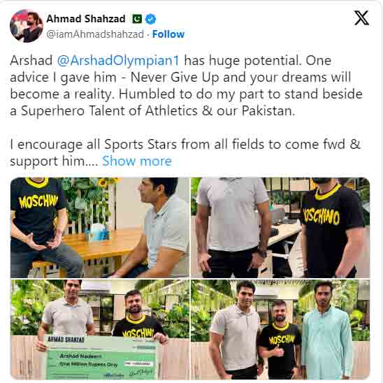 (ویب ڈیسک) ورلڈ ایتھلیٹکس چیمپئن شپ میں سلور میڈل جیتنے پر ایتھلیٹ ارشد ندیم کو قومی کرکٹر احمد شہزاد نے 10 لاکھ روپے کے چیک کا تحفہ دے دیا۔