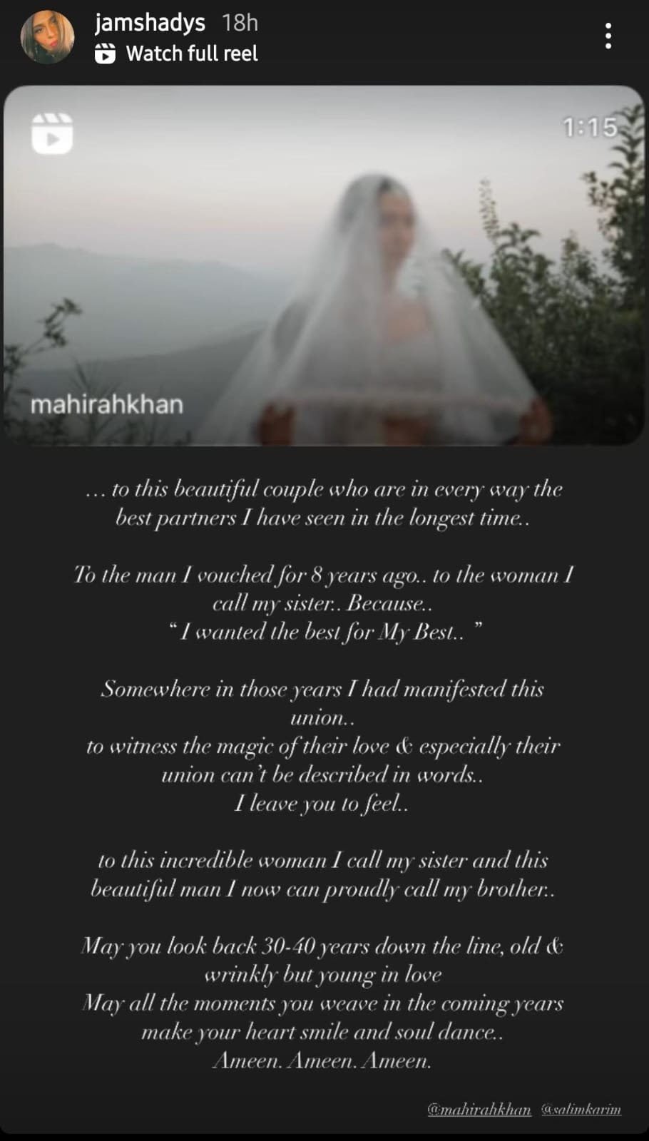 فیہا نور نے اپنی انسٹاگرام سٹوری میں کہا کہ ‘ماہرہ اور سلیم کریم بہترین شریک حیات ثابت ہوں گے، ماہرہ میری دوست نہیں بلکہ بہنوں کی طرح ہے اور میں نے 8 سال پہلے ہی ماہرہ کے لیے سلیم کا انتخاب کیا تھا کیونکہ میں اپنی دوست کے لیے بہترین چاہتی تھی،