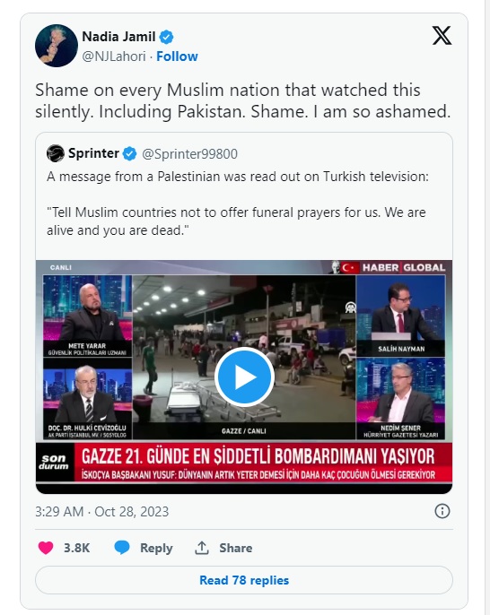 تفصیلات کےمطابق معروف اداکارہ نادیہ جمیل نے سماجی رابطے کی ویب سائٹ ایکس پر ترکیہ کے ٹیلی ویژن پروگرام کا ایک ویڈیو کلپ پوسٹ کیا جس میں ایک فلسطینی کا پیغام پڑھ کر سنایا جارہا تھا۔فلسطینی نے اپنے پیغام میں کہا تھا کہ مسلم ممالک سے کہو کہ وہ ہماری نماز جنازہ نہ پڑھیں، ہم زندہ ہیں اور تم مر چکے ہو۔