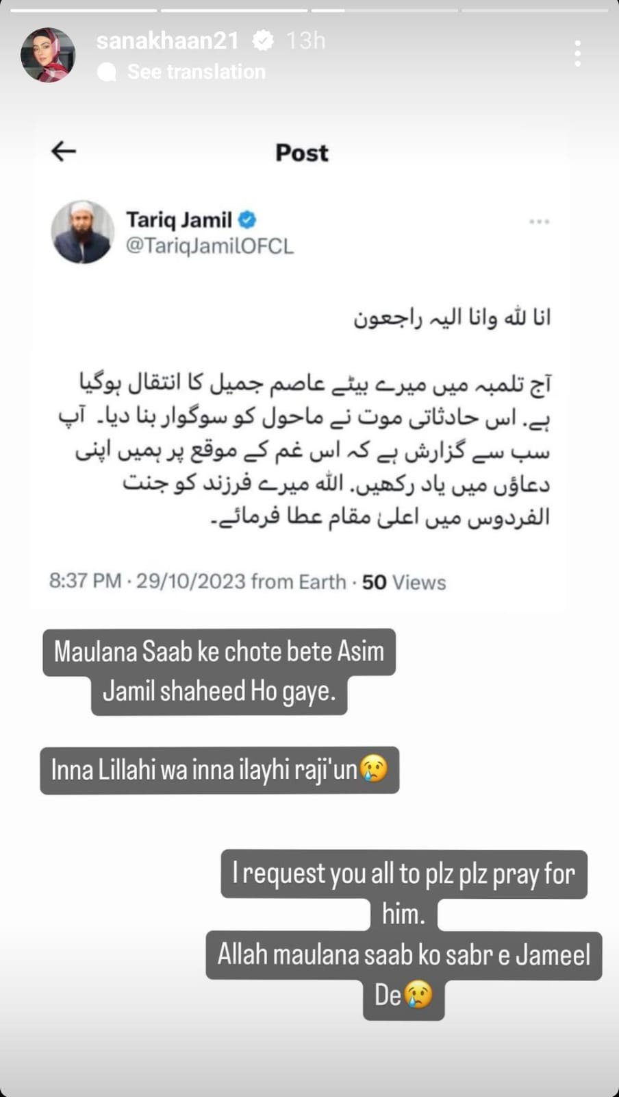 رپورٹ کے مطابق ثنا خان نے اپنے آفیشل انسٹاگرام اکاوْنٹ کی سٹوری میں مولانا طارق جمیل کا ٹویٹ پوسٹ کیا جس میں اُنہوں نے اپنے بیٹے کی موت کی تصدیق کرتے ہوئے کہا تھا کہ میرے بیٹے عاصم جمیل کا انتقال ہوگیا ہے، بیٹے کی موت کو حادثاتی قرار دیتے ہوئے انہوں نے سب سے بیٹے کے لیے دعائے مغفرت کی درخواست کی تھی۔