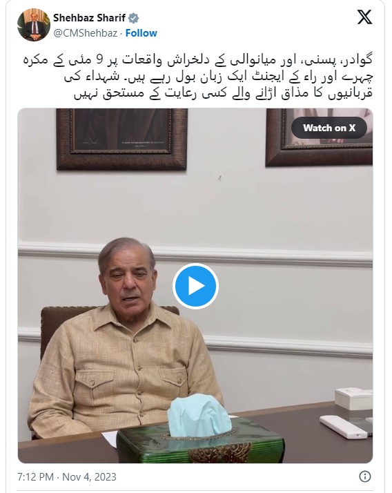 سابق وزیراعظم و صدر مسلم لیگ ن شہبازشریف نے اپنے ویڈیو پیغام میں کہا کہ گوادر، پسنی اور میانوالی کے دلخراش واقعات پر ہر دل غمزدہ ہے مگر 9 مئی کے مکروہ چہرے دشمن کی زبان بولنے سے باز نہیں آرہے۔