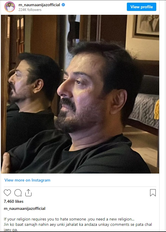 تفصیلات کےمطابق نعمان اعجاز نے اپنے آفیشل انسٹاگرام اکاوْنٹ پر اپنی تصویر پوسٹ کی اور پوسٹ کے کیپشن میں اُنہوں نے مذہب اور نفرت سے متعلق بات کی۔اداکار نے اپنی پوسٹ میں کہا کہ اگر آپ کا مذہب آپ سے یہ تقاضا کرتا ہے کہ آپ کسی سے نفرت کرو تو پھر آپ کو ایک نئے مذہب کی ضرورت ہے۔