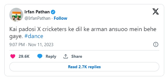 ساتھ ہی عرفان پٹھان نے 'ڈانس' کا ہیش ٹیگ بھی استعمال کیا۔سابق کرکٹر نے اپنی ٹوئٹ میں یہ واضح نہیں کیا کہ ان کا یہ پیغام کس پاکستانی کھلاڑی کے لیے تھا۔