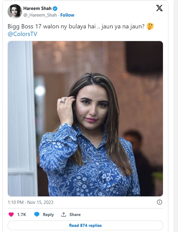 حریم شاہ نے اپنی پوسٹ میں کہا کہ مجھے بگ باس کے سیزن 17 کے لیے بُلایا گیا ہے، اُنہوں نے صارفین سے اُن کی رائے دریافت کرتے ہوئے پوچھا کہ میں اس پیشکش کو قبول کرکے بگ باس میں جاوْں یا نہیں؟