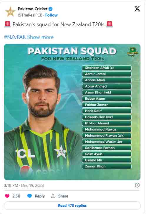 انہوں نے کہا شاداب خان اہم کھلاڑی ہیں، بدقسمتی سے انجری کا شکار ہیں، وسیم جونیئر ،زمان خان ،عامر جمال بھی سکواڈ میں شامل ہیں۔ اس کے ساتھ ساتھ اعظم خان، عباس آفریدی، محمد نواز، ابرار احمد، اسامہ میر، حارث رؤف، وسیم جونیئر اور حسیب اللہ خان بھی سکواڈ کا حصہ ہیں، شاہین شاہ آفریدی ٹی 20 ٹیم کی قیادت کریں گے۔