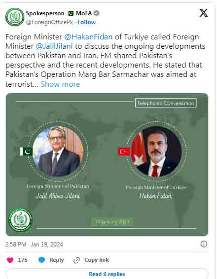 پاکستان اور ایران کے درمیان تناؤ کے پیش نظر ترکیہ کے وزیر خارجہ نے بھی نگران وزیر خارجہ جلیل عباس جیلانی کو فون کیا اور پاکستان اور ایران کے درمیان جاری معاملات پر تبادلہ خیال کیا۔