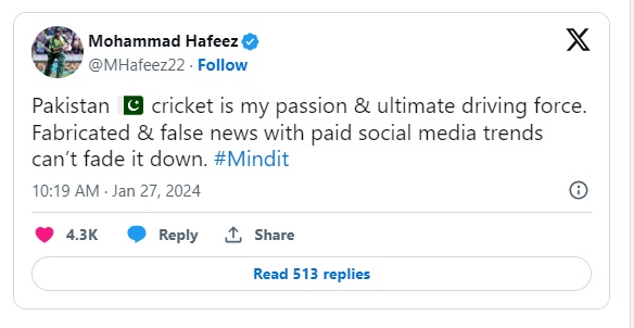 اس حوالے سے سوشل میڈیا پر ہی اپنے پیغام میں محمد حفیظ نے کہا کہ کرکٹ ہی میرا جنون اور زندگی میں سب سے اہم طاقت ہے، سوشل میڈیا پر پیشہ ور افراد کی مدد سے پھیلائی جانے والی خود ساختہ اور غلط خبریں اس میں کوئی کمی نہیں لاسکتیں۔