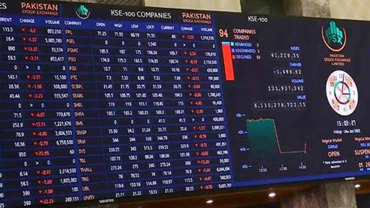 کاروباری ہفتے کے پانچویں اور آخری روز پاکستان سٹاک مارکیٹ میں کاروبار کا اختتام منفی زون میں ہوا جس کے باعث 100 انڈیکس ایک ہزار 147 پوائنٹس کی کمی کیساتھ 59 ہزار873 پوائنٹس کی سطح پر بند ہوا۔یاد رہے کہ گزشتہ روز 100 انڈیکس 1133 پوائنٹس کی کمی کیساتھ 61 ہزار 20 پوائنٹس کی سطح پر بند ہوا تھا۔