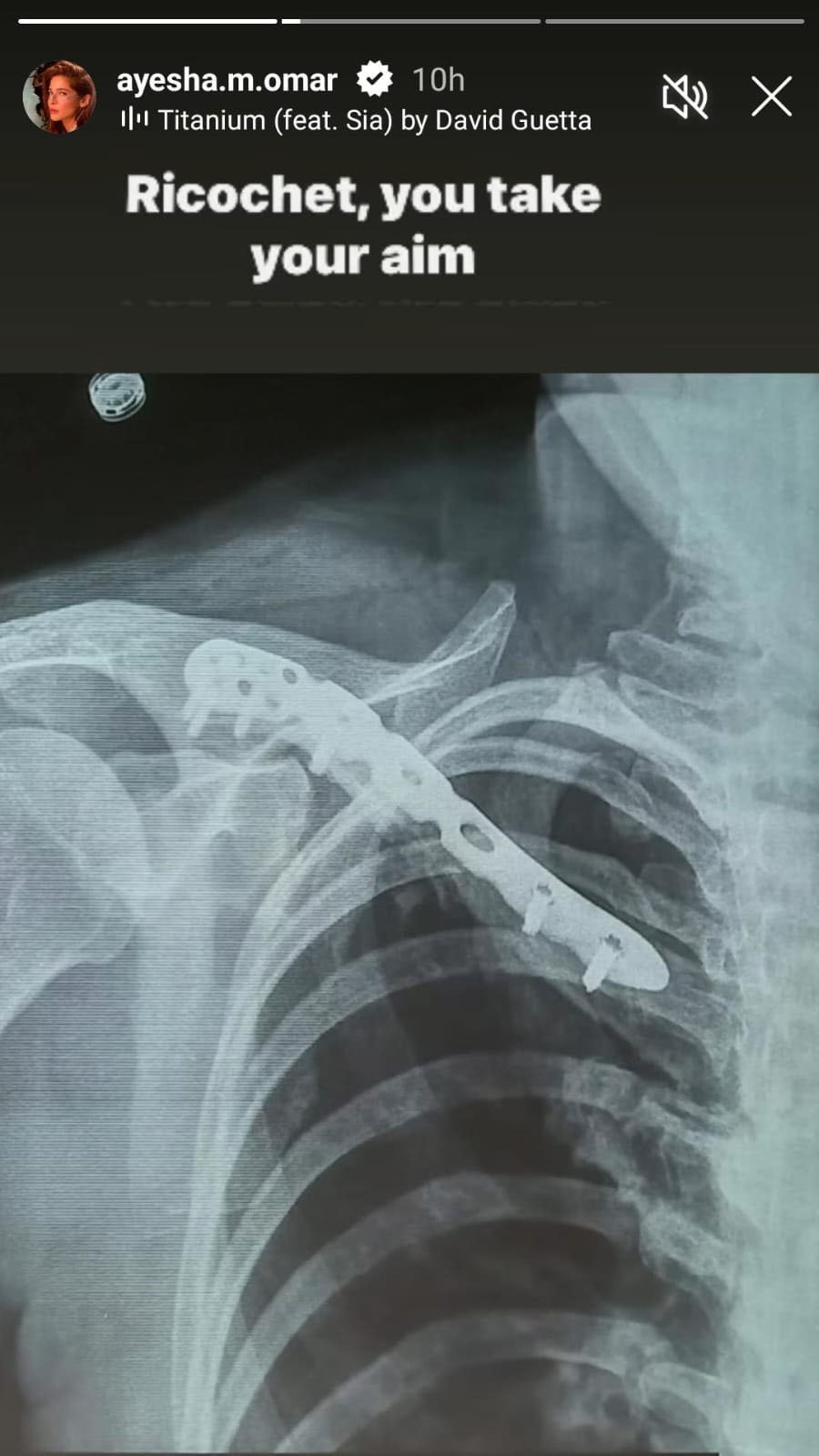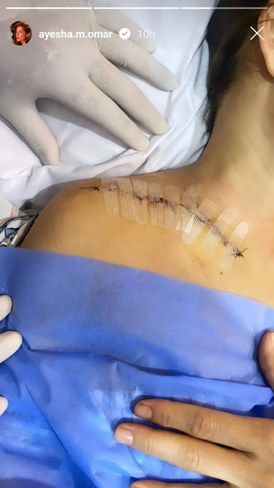 اب عائشہ عُمر نے اپنے آفیشل انسٹاگرام کی اسٹوری میں اپنی ‘کالر بون’ سرجری کی تصویر شیئر کی ہے جس میں اداکارہ کی گردن سے کندھے تک ہونے والی سرجری دیکھی جاسکتی ہے۔اس کے علاوہ عائشہ عُمر نے اپنی ‘کالر بون’ کے ایکسرے کی تصویر بھی اپنے مداحوں کے ساتھ انسٹاگرام اسٹوری میں شیئر کی۔