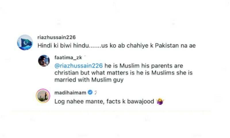 اس کمنٹ کے رپلائی میں ایک صارف نے وضاحت کرتے ہوئے لکھا کہ لڑکا مسلمان ہے اور اس کے والدین مسیحی ہیں لیکن اصل بات یہ ہے کہ اداکارہ نے مسلم لڑکے سے شادی کی ہے۔جس پر مدیحہ امام نے ردعمل دیتے ہوئے کہا کہ حقائق کے باوجود لوگ نہیں مانتے۔