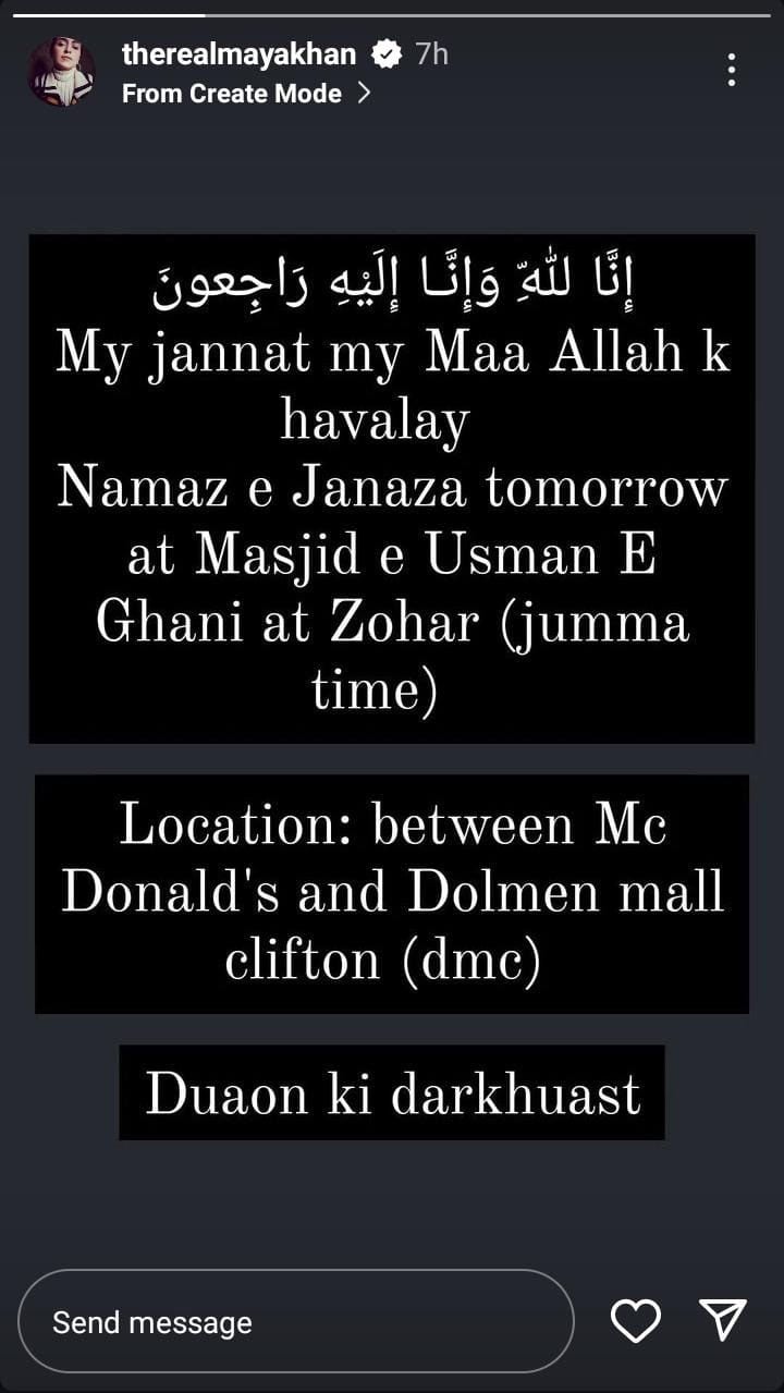 رپورٹ کے مطابق مایا خان نے فوٹو اینڈ ویڈیو شیئرنگ ایپ انسٹاگرام کی اسٹوری میں اپنی والدہ کے انتقال کی افسوسناک خبر شیئر کی۔اداکارہ نے اپنی انسٹاگرام اسٹوری میں کہا کہ میری جنت، میری ماں، اب اللہ تعالیٰ کے حوالے ہیں۔